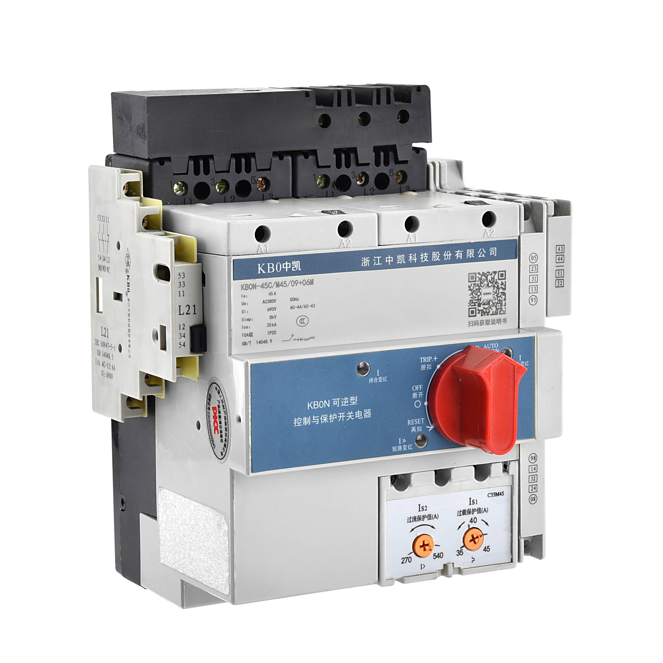 KB0N可逆型控制與保護開關是由兩臺KB0基本型產品主體,通過增加切換機械聯鎖、電氣聯鎖、相序切換銅排、輔助模塊等組成。可逆型開關電器,主要通過外部控制回路,實現電源至電動機的相序改變,從而實現電動機的正、反轉控制。